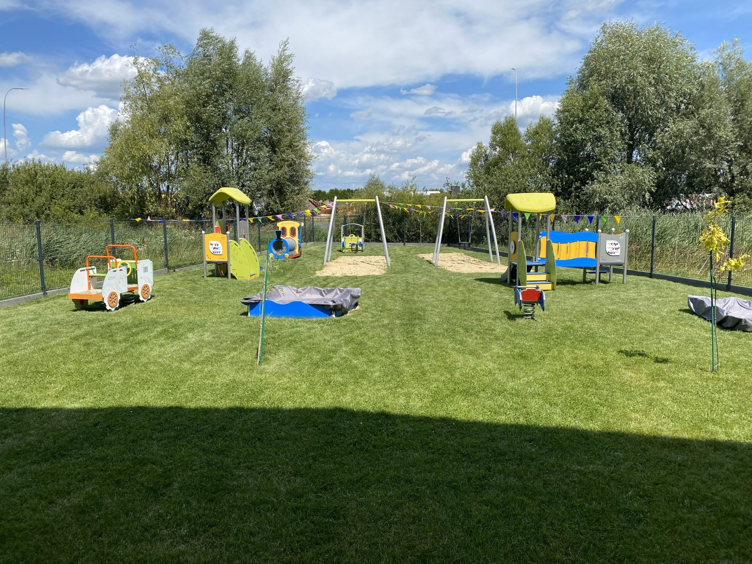 Żłobek posiada własny plac zabaw wyposażony m.in. w piaskownice, huśtawki i bujaki, co umożliwia dzieciom bezpieczną aktywność ruchową na świeżym powietrzu.